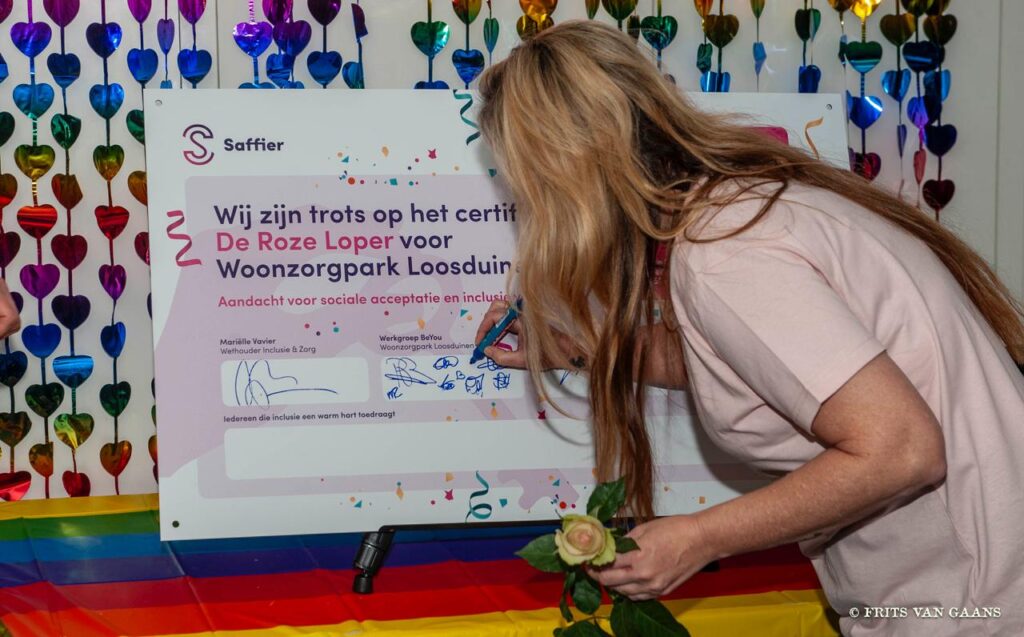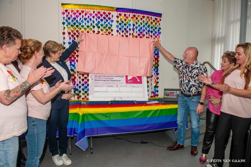 De uitreiking vond plaats in aanwezigheid van bewoners, medewerkers, buurtbewoners en samenwerkingspartners. Wethouder Zorg en Inclusie, Mariëlle Vavier verrichtte samen met vertegenwoordigers van De Roze Loper en het team van Woonzorgpark Loosduinen de officiële handeling.